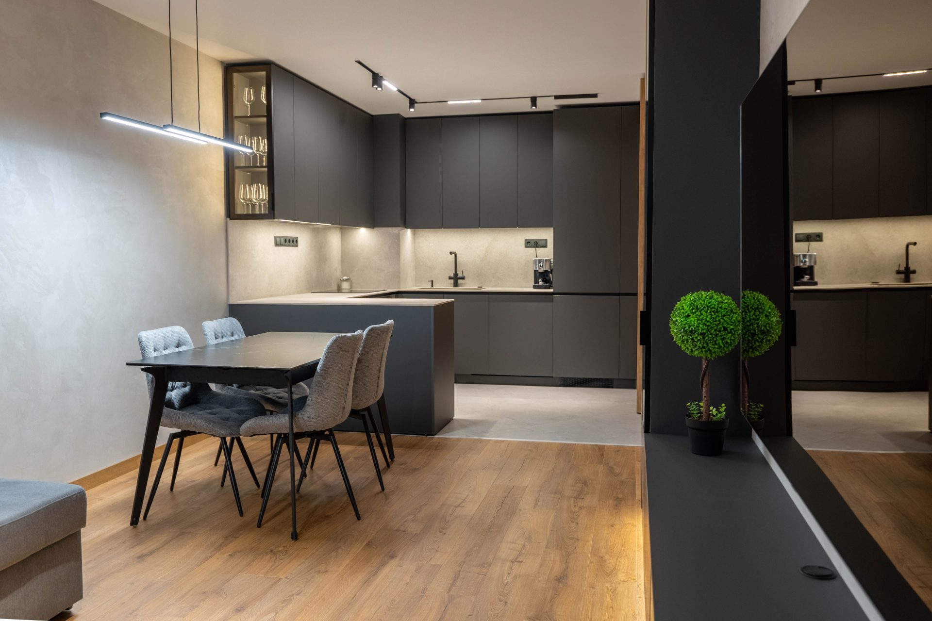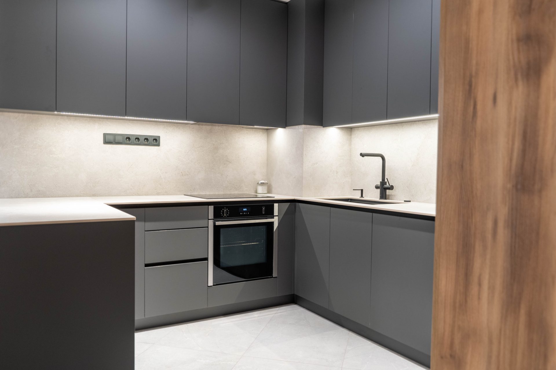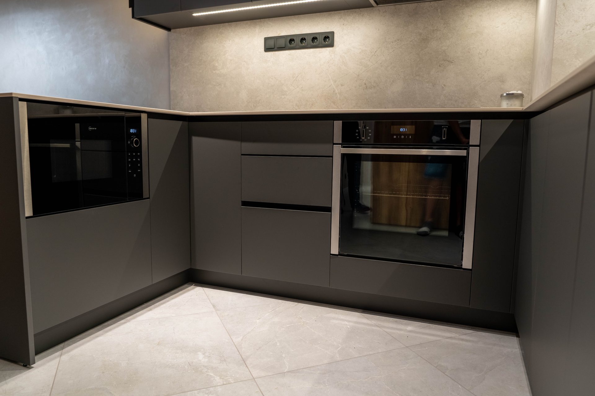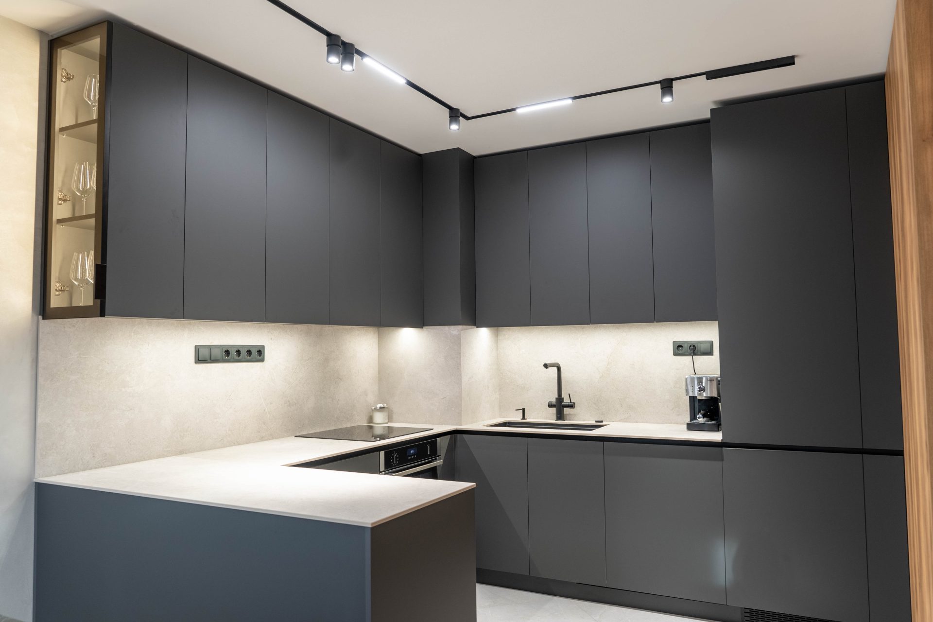Тази модерна кухня впечатлява с изчистена геометрия, минималистична визия и функционално разпределение. Светлият плот и гръб добавят фин контраст и усещане за лекота, като същевременно са практични и устойчиви на ежедневна употреба.